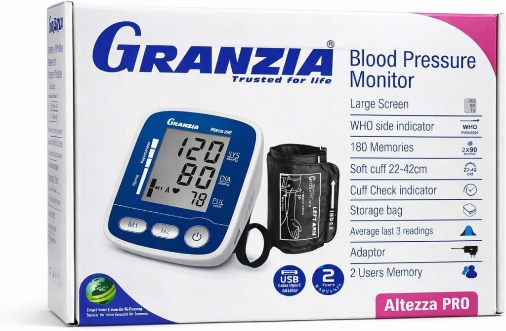 جرانزيا التزا برو PRO جهاز قياس ضغط الدم الرقمي شاشة كبيرة، ذاكرة ذكية، ومؤشر WHO لمتابعة صحية دقيقة
