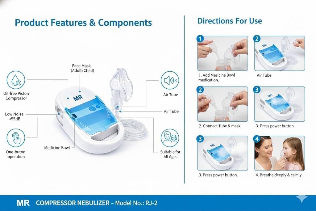 جهاز بخاخات ضاغط طبي RJ-2 مصمم لتقديم علاج فعال لمشاكل الجهاز التنفسي.
