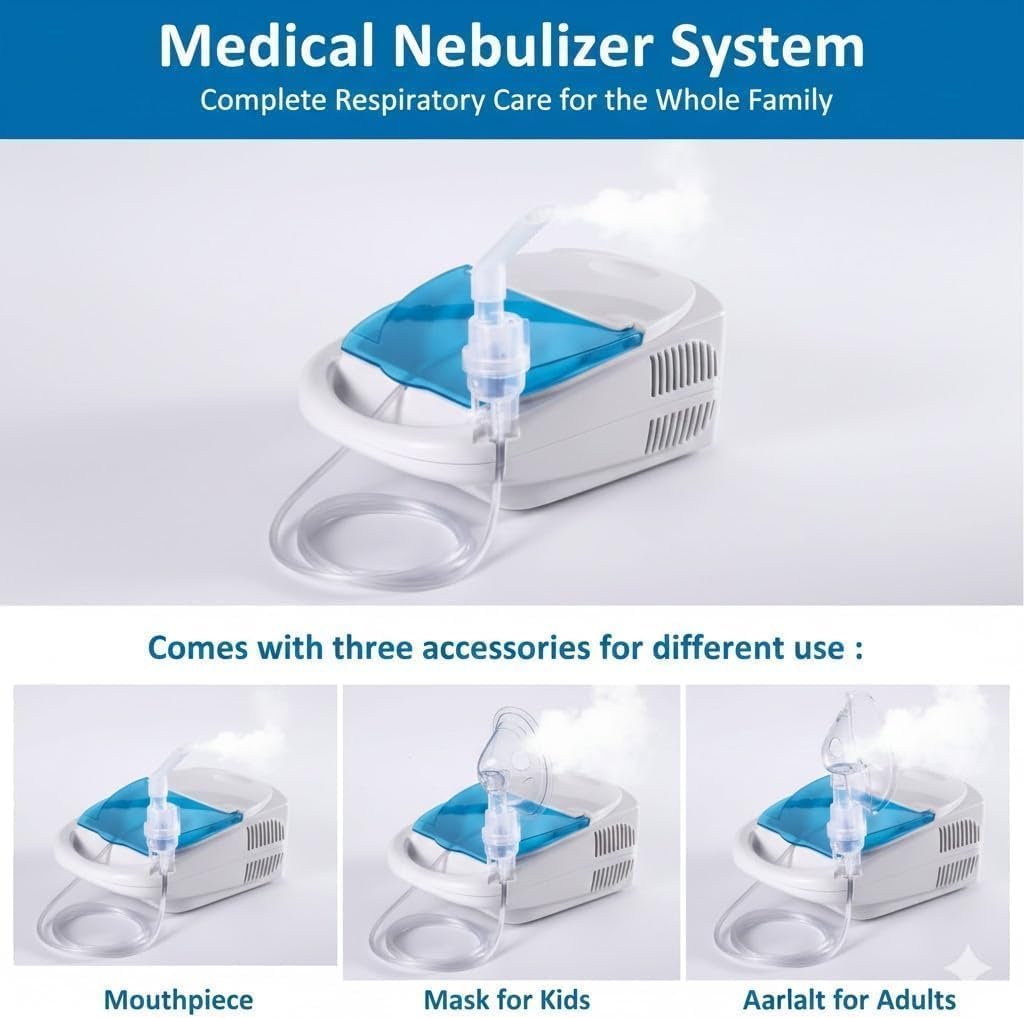 جهاز بخاخات ضاغط طبي موديل RJ-2 – نظام استنشاق بخار للعناية بالجهاز التنفسي – مناسب لجميع الأعمار – مع كمامة للأطفال والبالغين وقطعة فم – ضوضاء منخفضة – لون أزرق وأبيض