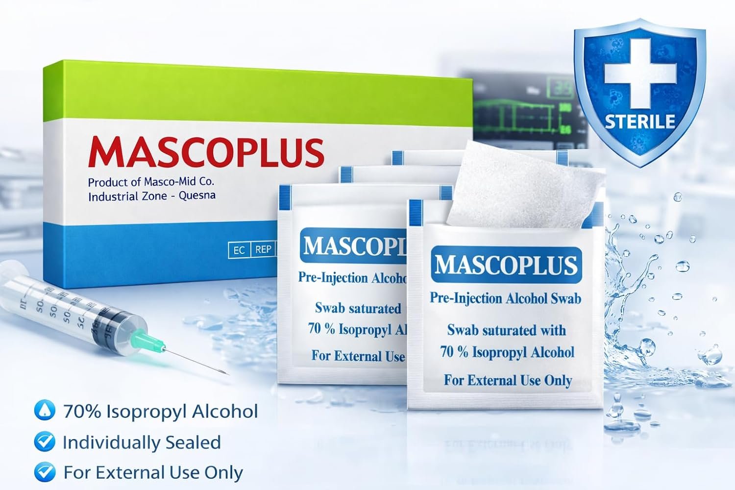 ماسكوميد Mascomed مناديل تنظيف كحولية – 75٪ كحول إيثانول، عبوة 100 قطعة (مسحة كحولية ماسكو بلاس)