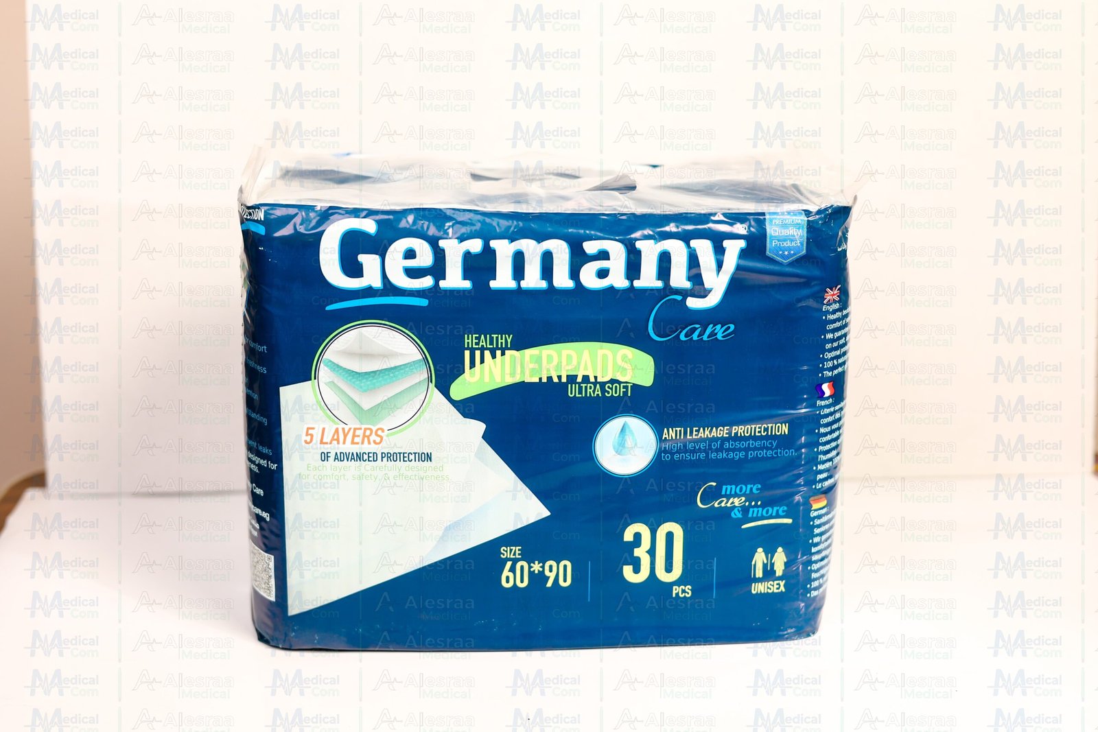 مفرش طبي ماص Germany Care Healthy – جيرمنى مكون من 5 طبقات حماية – مقاس 60×90 سم – عبوة 30 قطعة – حماية ضد التسريب – للجنسين